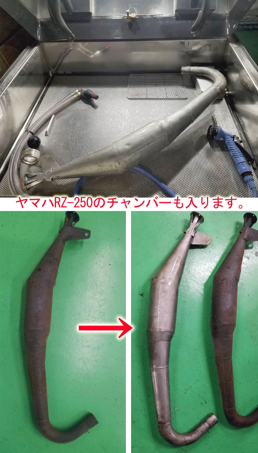 当社のRebornの一番人気は今までストレートタイプでした。それよりも更に大きい物が入るサイズのRebornを作りました。RZ250のチャンバーも楽々入ります。(サイレンサーは外したら)