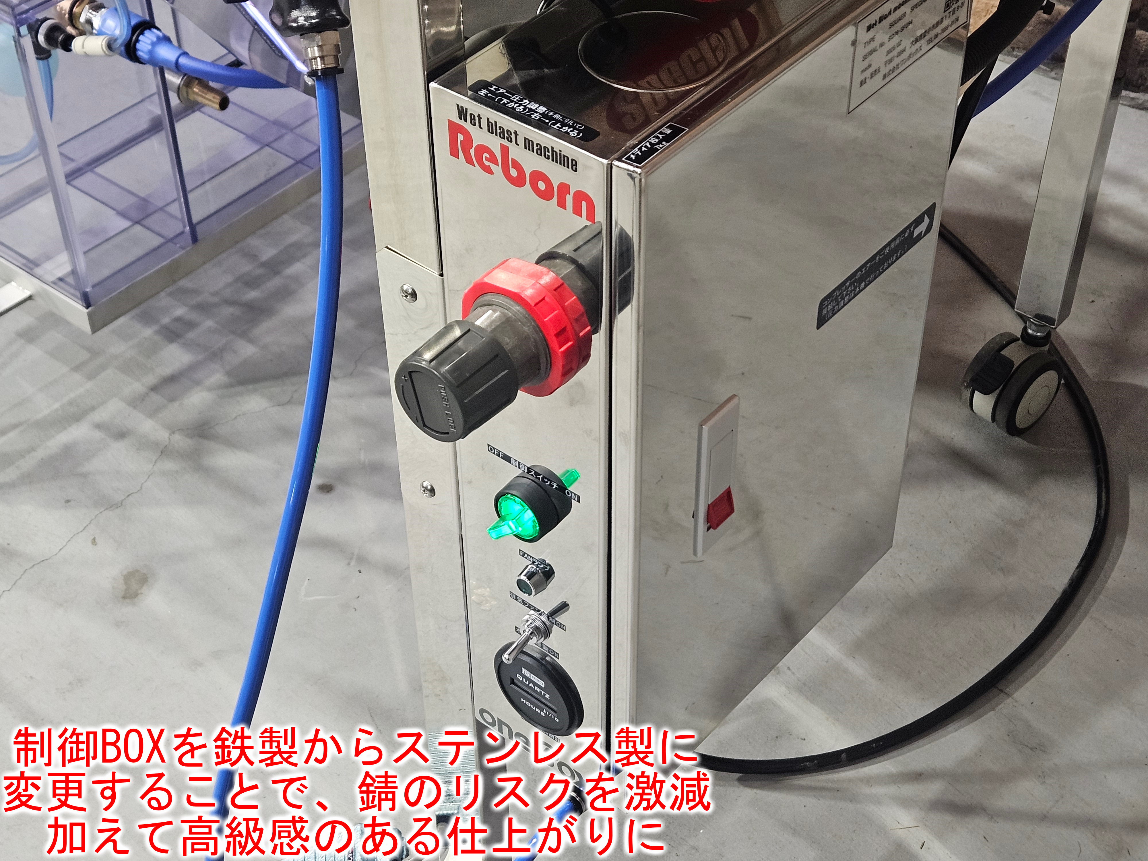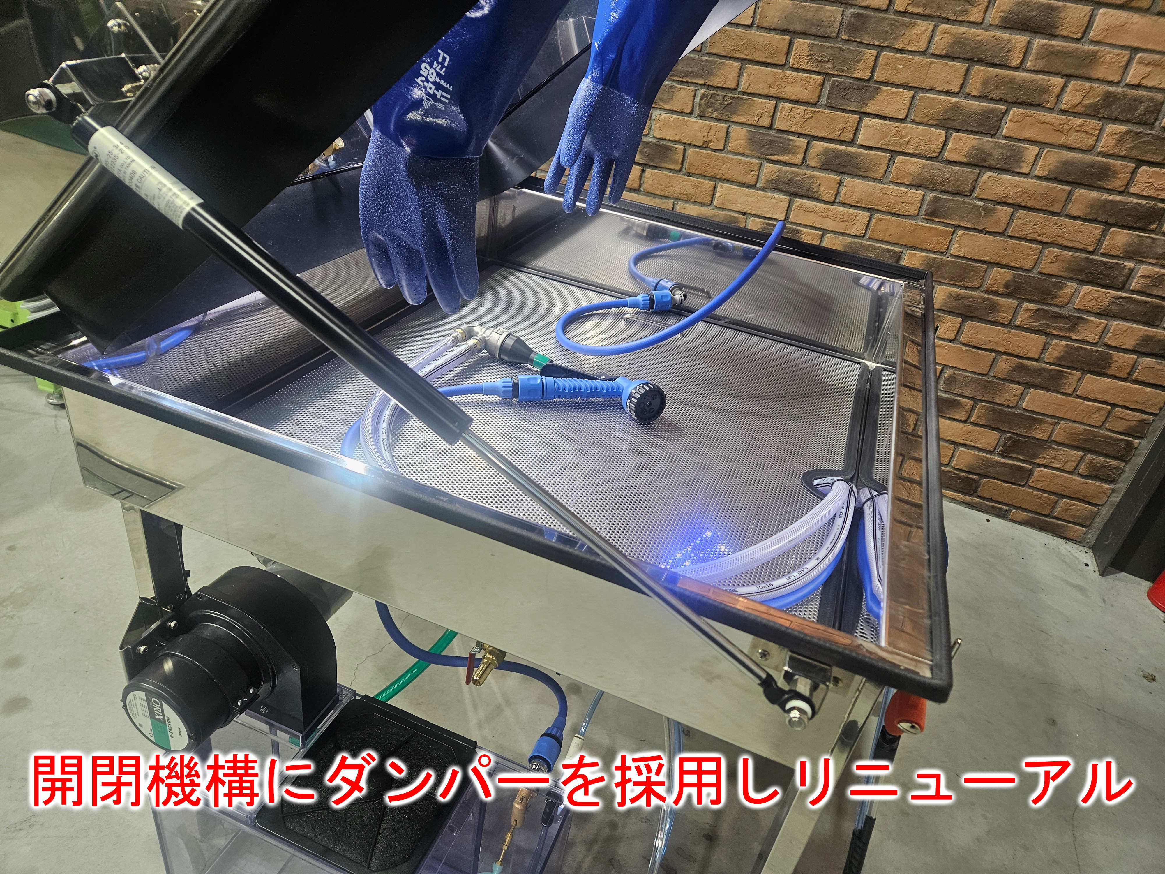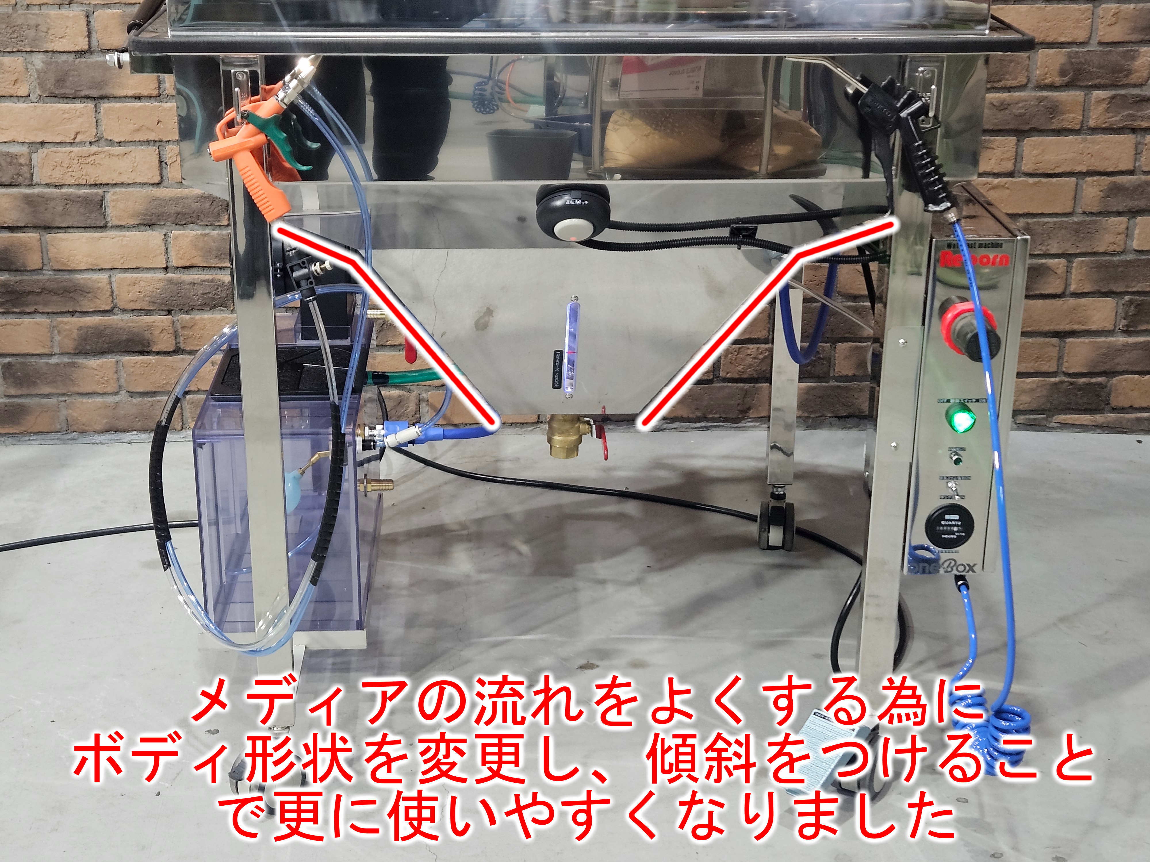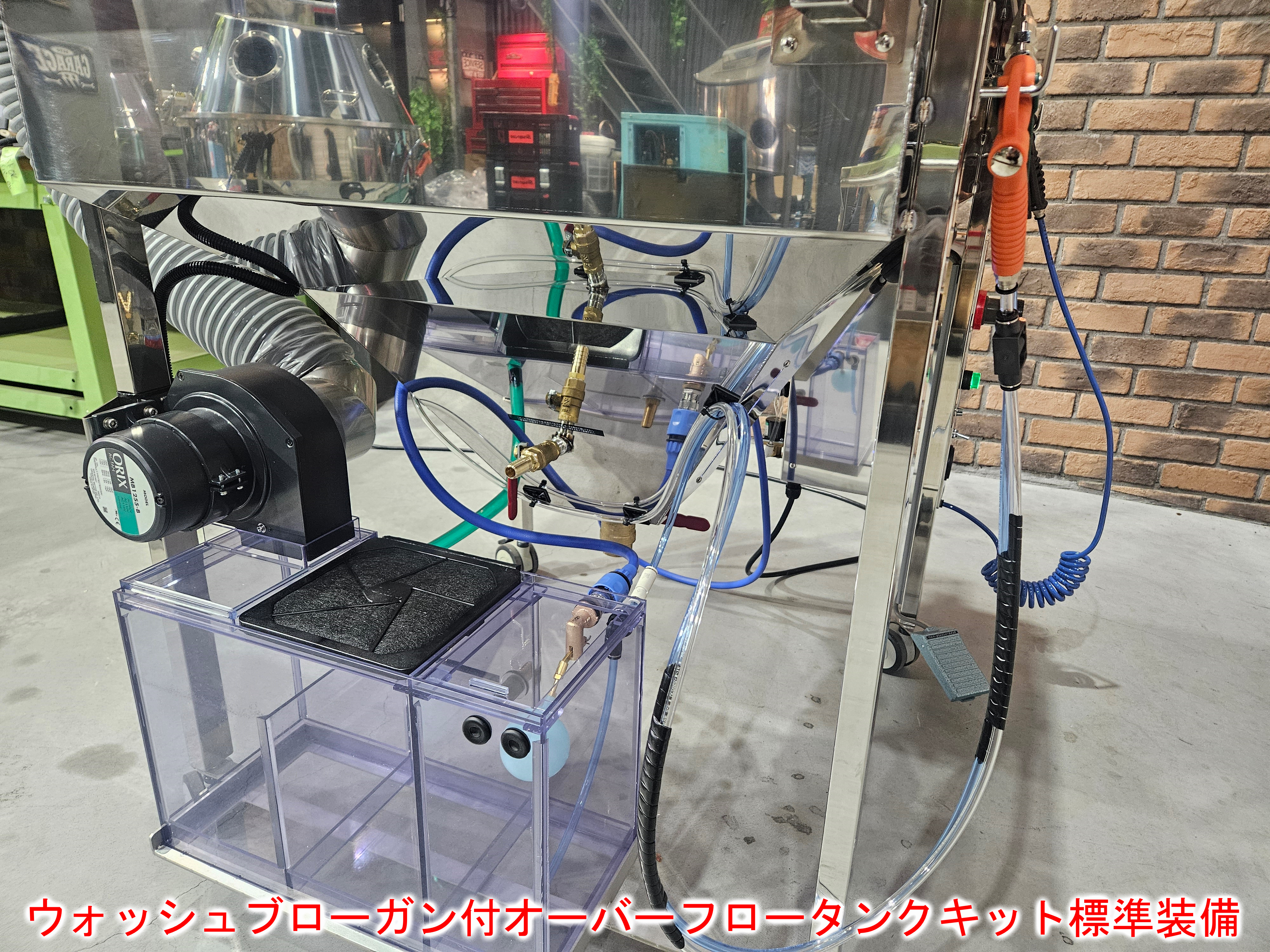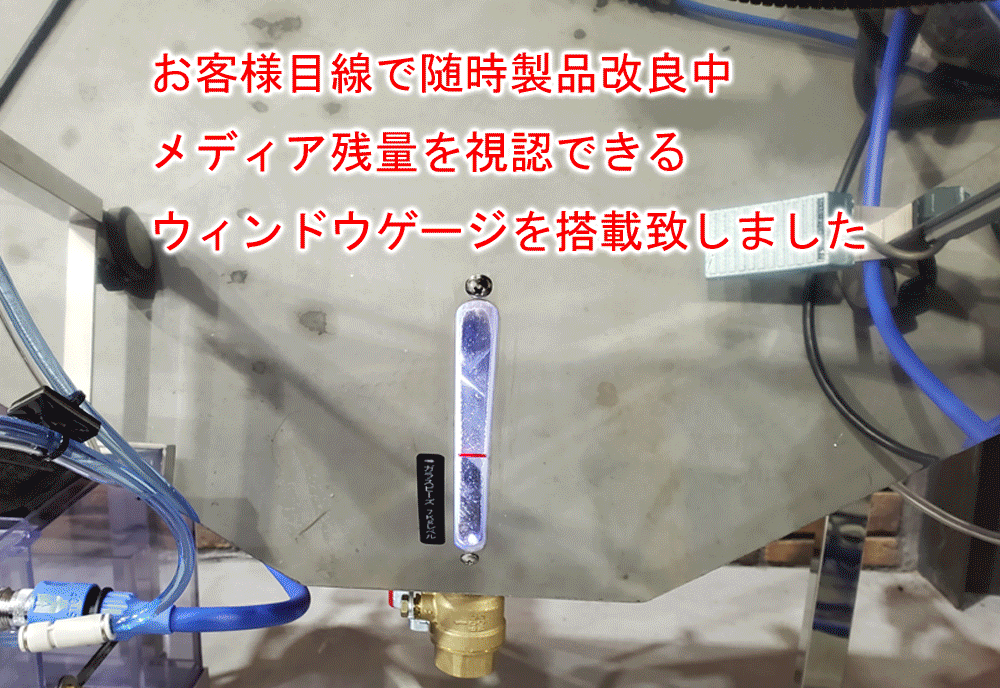 | 装備 | ブラストガン、エアーガン、水シャワーガン、電動ワイパー、開口部ダンパー、ウォッシャーノズル、アワーメーター、四角形強化ガラス、移動キャスター、制御ボックス、電源ケーブル4m、水入口ホース3m、ポンプモーター(400W型) ウォッシュブローガン付きオーバーフロータンクキット標準装備 |