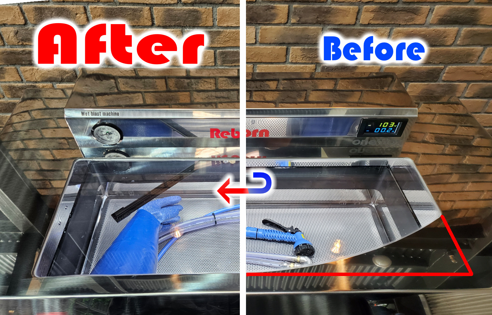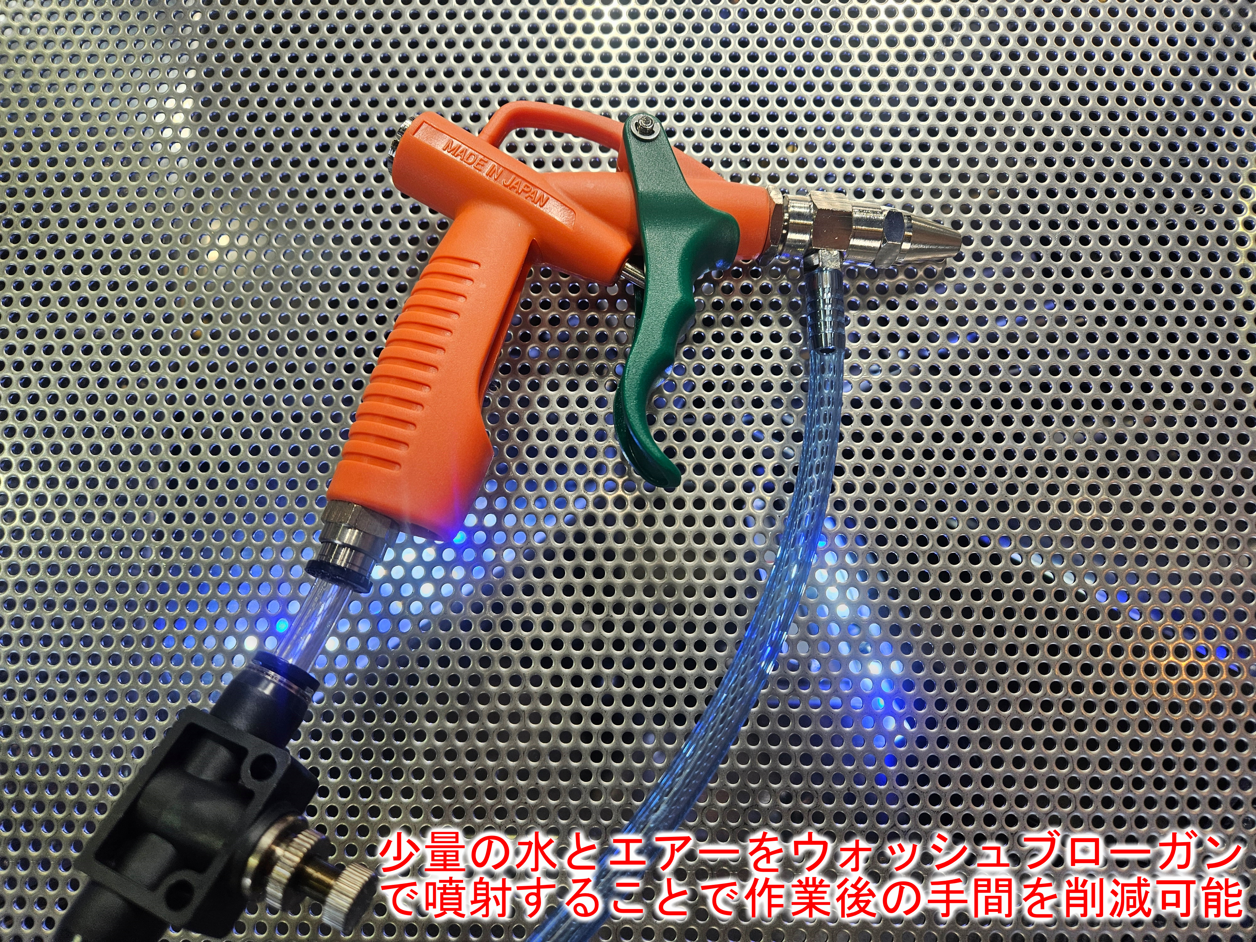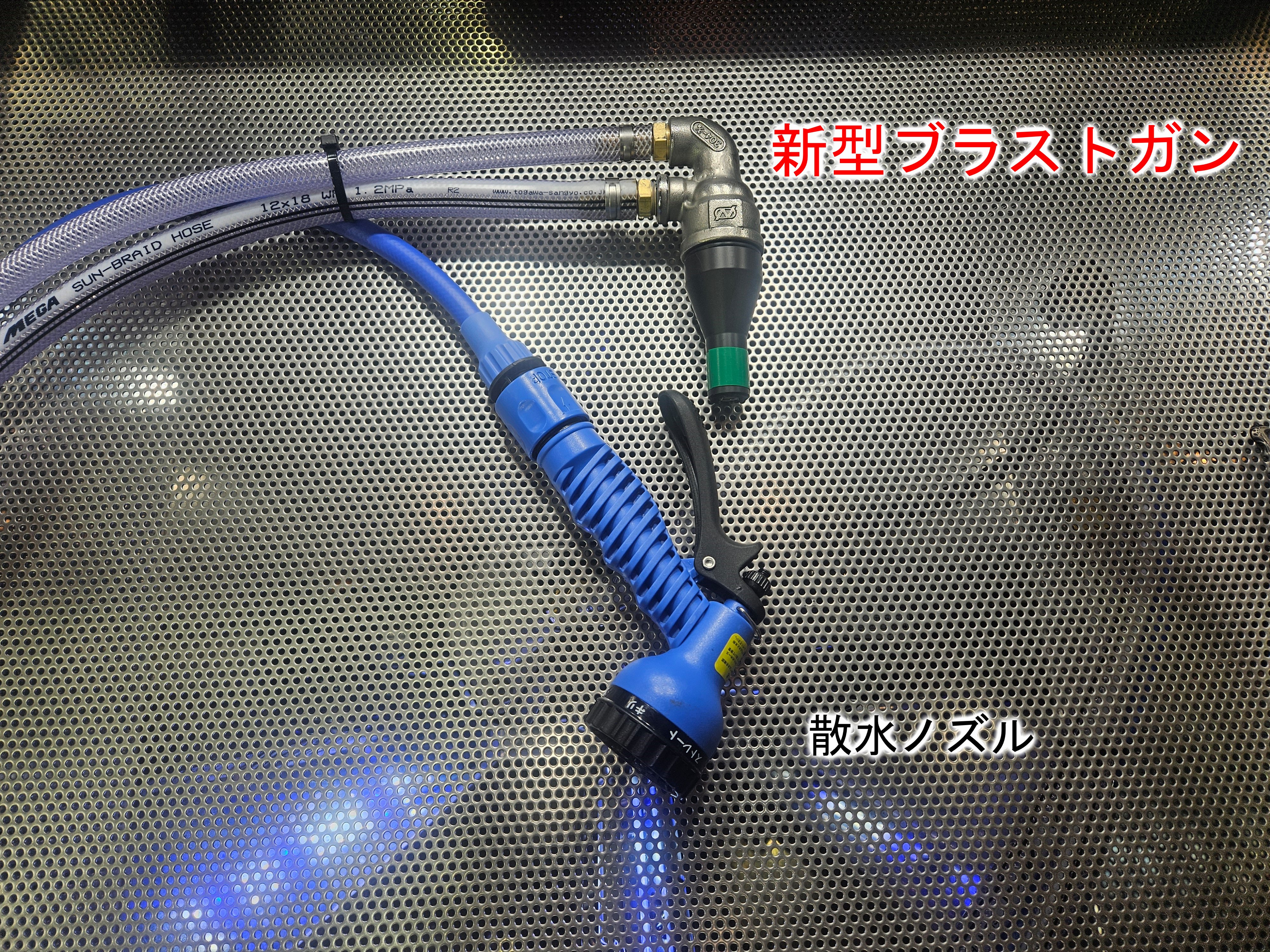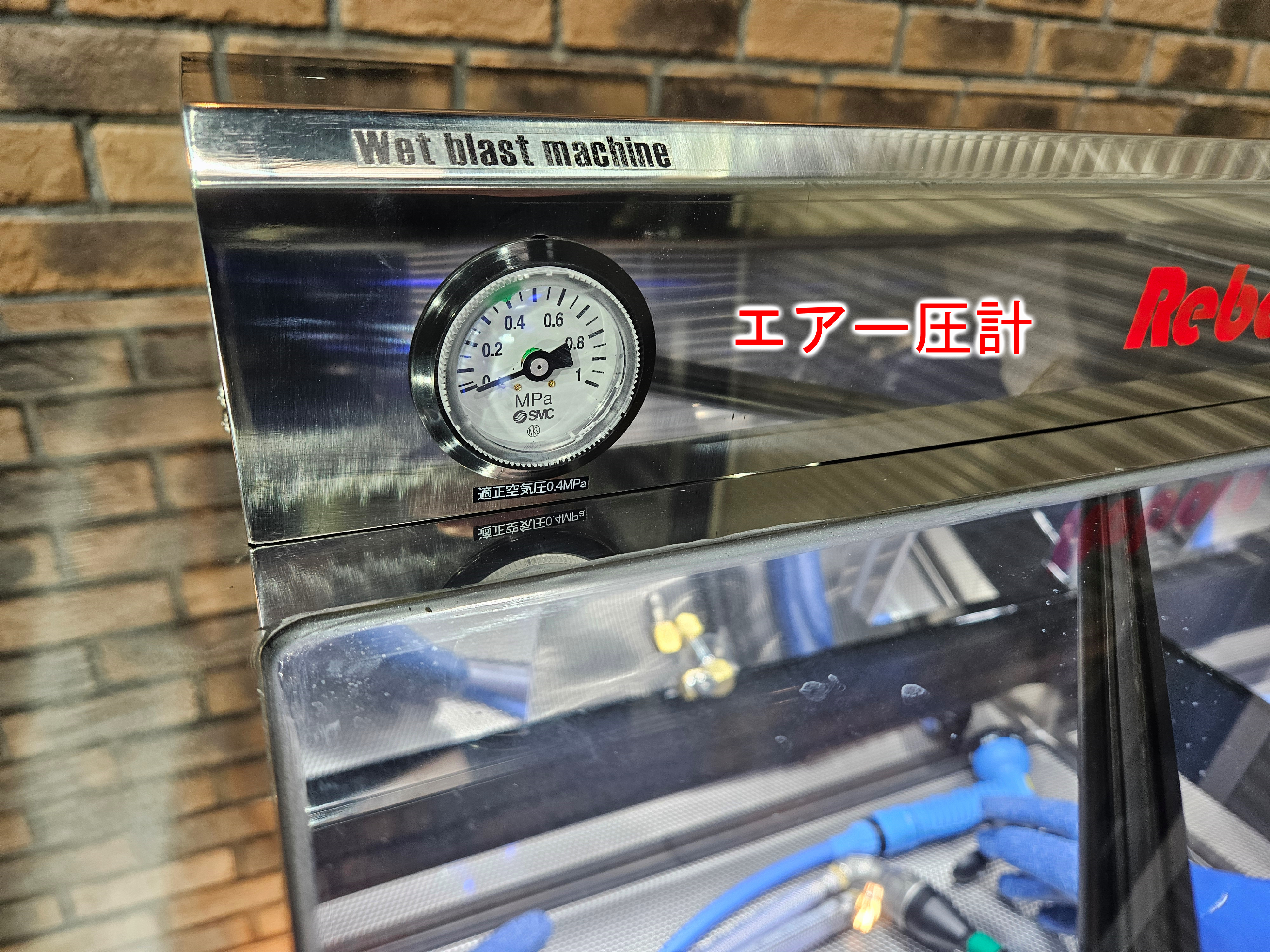 | 装備 | ブラストガン、エアーガン、水シャワーガン、電動ワイパー、開口部ダンパー、ウォッシャーノズル、アワーメーター、四角形強化ガラス、移動キャスター、制御ボックス、電源ケーブル4m、水入口ホース3m、ポンプモーター(400W型) ウォッシュブローガン付きオーバーフロータンクキット標準装備 |